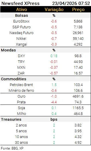 Agenda internacional de dados: A prévia do PMI de abril no Japão registrou 52,4 pontos no composto (vs 53 em março), com manufaturados em 54,9 (vs 51,6 em t-1) e serviços em 51,2 (vs 53,4). Na Zona do Euro, o total marcou 48,6 pontos (est 50,1), com manufaturados em 52,2 (est 50,9) e serviços em 47,4 (est 49,8). No Reino Unido, o composto ficou em 52 (est 49,8), com manufaturados em 53,6 (est 50,3) e serviços em 52 (est 50).