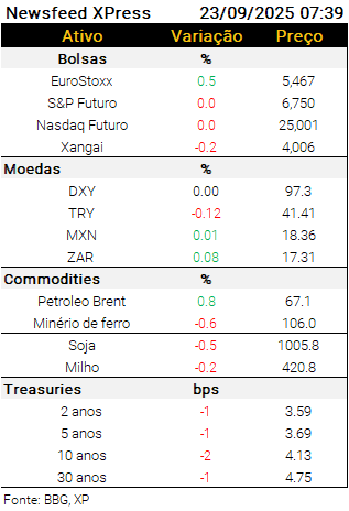 Agendas de Lula e Haddad: Em Nova York, Lula discursa na abertura da Assembleia Geral da ONU, às 10h, e participa de reunião sobre o Fundo de Florestas Tropicais para Sempre, às 16h. Haddad, por sua vez, concede entrevista ao vivo ao ICL Notícias, às 8h30, e participa de congresso de direito tributário, às 19h.