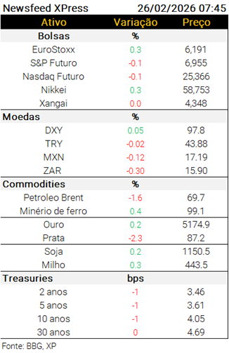 Este material foi elaborado pela XP Investimentos CCTVM S/A (“XP Investimentos” ou “Companhia”) e não deve ser considerado um relatório de análise para os fins na Resolução CVM 20/2021. As opiniões, projeções e estimativas aqui contidas são meramente indicativas da opinião do autor na data da divulgação do documento sendo obtidas de fontes públicas consideradas confiáveis e estando sujeitas a mudanças a qualquer momento sem necessidade de aviso ou comunicado prévio. A Companhia não apoia ou se opõe contra qualquer partido político, campanha política, candidatos ou funcionários públicos. Sendo assim, XP Investimentos não está autorizada a doar fundos, propriedades ou quaisquer recursos para partidos ou candidatos políticos e tampouco fará reembolsos para acionistas, diretores, executivos e empregados com relação a contribuições ou gastos neste sentido. XP Investimentos e suas afiliadas, controladoras, acionistas, diretores, executivos e empregados não serão responsáveis (individualmente e/ou conjuntamente) por decisões de investimentos que venham a ser tomadas com base nas informações divulgadas e se exime de qualquer responsabilidade por quaisquer prejuízos, diretos ou indiretos, que venham a decorrer da utilização deste material ou seu conteúdo. Os desempenhos anteriores não são necessariamente indicativos de resultados futuros. Este material não leva em consideração os objetivos de investimento, situação financeira ou necessidades específicas de qualquer investidor. Os investidores devem obter orientação financeira independente, com base em suas características pessoais, antes de tomar uma decisão de investimento. Este relatório é destinado à circulação exclusiva para a rede de relacionamento da XP Investimentos, incluindo agentes autônomos da XP e clientes da XP, podendo também ser divulgado no site da XP. Fica proibida sua reprodução ou redistribuição para qualquer pessoa, no todo ou em parte, qualquer que seja o propósito, sem o prévio consentimento expresso da XP Investimentos.