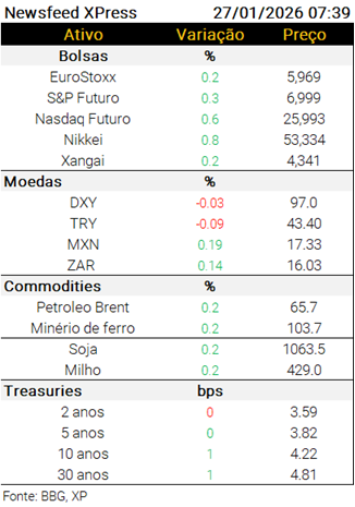 Agenda internacional de dados: Os lucros industriais da China fecharam o ano de 2025 com alta de 0,6% ante 2024. Nos EUA, teremos ADP semanal, às 10h15, preços de imóveis, às 11h00 e confiança do consumidor do Conference Board, às 12h.
