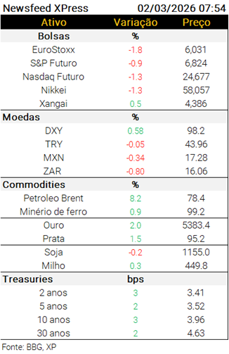 Passando para a seara internacional, a CNN sustenta que o governo brasileiro vê com cautela a escalada no conflito no Oriente Médio (https://tinyurl.com/5yp57etf) e que Lula pretende tratar do tema no encontro que espera ter em breve com Donald Trump. De acordo com as informações, contudo, o presidente brasileiro deve evitar fazer críticas diretas aos ataques americanos ou aos Estados Unidos, além de se oferecer como um mediador para criar um canal de diálogo entre EUA e Irã (https://tinyurl.com/567b85f7). Veja também a nota publicada ontem na qual o time XP Macro detalha os impactos da alta do petróleo na inflação, no fiscal e na balança comercial (app: https://bit.ly/4cUna6T | desktop: https://tinyurl.com/3u2ak35m).