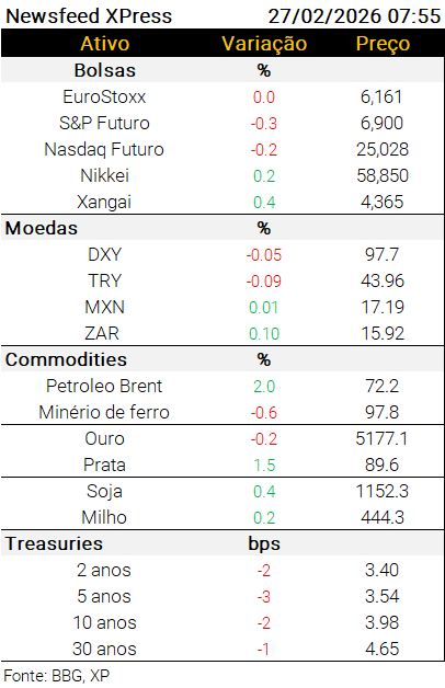 Agenda internacional de dados: No Japão, o Tokyo CPI subiu 1,6% a/a em fevereiro (exp. 1,4%), com o núcleo avançando 1,8% a/a (exp. 1,7%). As vendas no varejo cresceram 4,1% a/a em janeiro (exp. 1,5%) e a produção industrial avançou 2,2% m/m (exp. 5,5%). Na Zona do Euro, as expectativas de inflação de 1 ano caíram de 2,8% em dezembro para 2,6% em janeiro (exp. 2,7%), enquanto as de 3 anos permaneceram em 2,6% (exp. 2,7%).  Na Alemanha, os CPIs regionais de fevereiro foram divulgados nessa manhã e às 10h teremos o dado nacional. Por lá, a taxa de desemprego ficou estável em 6,3% em fevereiro.