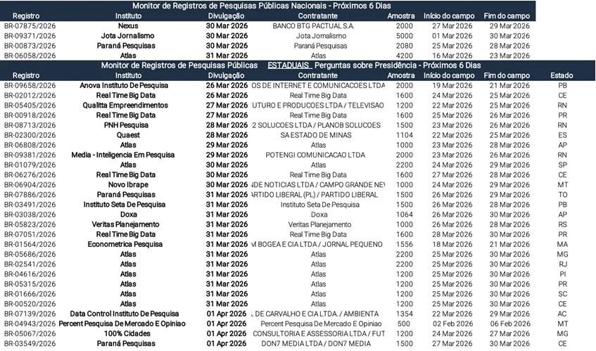 Monitor de pesquisas: Três levantamentos nacionais (Nexus, Jota e Paraná Pesquisas) podem ser divulgados a partir da próxima segunda. Nova pesquisa Atlas pode sair a partir de terça – de acordo com o questionário registrado no TSE, ela será focada na rejeição dos pré-candidatos.
