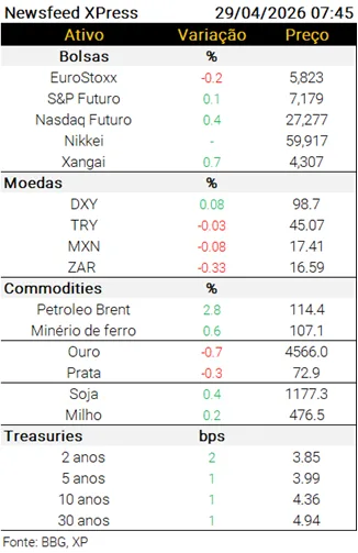 Agenda internacional de dados: Na Zona do Euro, o M3 cresceu 3,2% a/a em março (exp. 3,1%), enquanto a leitura final da confiança do consumidor ficou em -20,6 em abril, em linha com a prévia. Na Alemanha tivemos a divulgação dos CPIs regionais mais cedo, com o dado nacional sendo divulgado às 9h. Nos EUA, às 9h30 teremos a divulgação dos dados de março de iniciação de casas novas, concessões de alvarás e encomendas de bens duráveis. Às 15h será divulgada a decisão de política monetária do FOMC e às 15h30, Jerome Powell concede entrevista coletiva. E no fim da tarde de hoje teremos a divulgação dos resultados de Alphabet, Microsoft, Amazon e Meta.