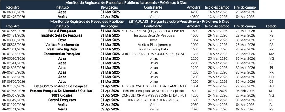 Monitor de pesquisas: Pesquisas Atlas — que deve ser focada na rejeição dos pré-candidatos — e Veritá podem sair a partir de hoje e sábado, respectivamente.