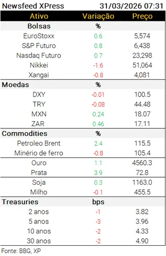 Agenda internacional de dados: No Japão, o CPI de Tóquio ficou em 1,4% a/a (est 1,3%), a taxa de desemprego ficou em 2,6% (est 2,7%), as vendas de varejo registraram queda de 2% m/m (est -1%) e a produção industrial caiu 2,1% m/m (est -2%). Na China, o PMI composto de março ficou em 50,5 pontos, com manufaturados em 50,4 (est 50,1) e serviços em 50,1 (est 49,9). Na Zona do Euro, o CPI ficou em 2,5% a/a (est 2,6%), com núcleo em 2,3% (est 2,4%).