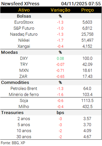 Os futuros das bolsas americanas começam o dia em queda, com as discussões sobre o valuation de empresas de inteligência artificial novamente em foco.