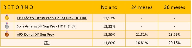 No ano, o fundo Solis Antares XP Seg Prev FIC FIRF CP obteve uma performance de 13,35% contra um CDI de 11,80%. O fundo se trata de uma estratégia em crédito high yield que conta em seu portfólio com uma parcela destinada a investimentos em FIDCS.