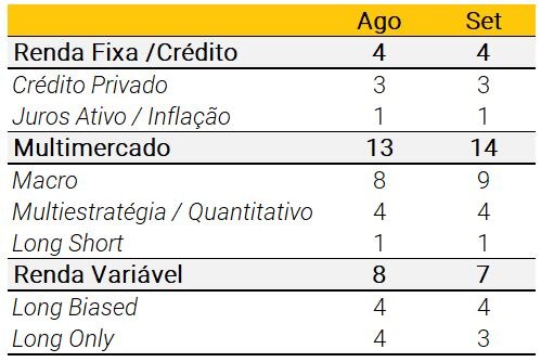 No agregado das estratégias do Top 25, para o mês de setembro, houve a redução de uma alternativa no grupo de Renda Variável Long Only para abrir espaço a um produto na classe Multimercado Macro – são fundos que tendem a se beneficiar da flexibilização que a regulação previdenciário tem tido historicamente, de forma que os mandatos na previdência tendem a refletir cada vez mais as suas respectivas estratégias entre os fundos de investimento (555).