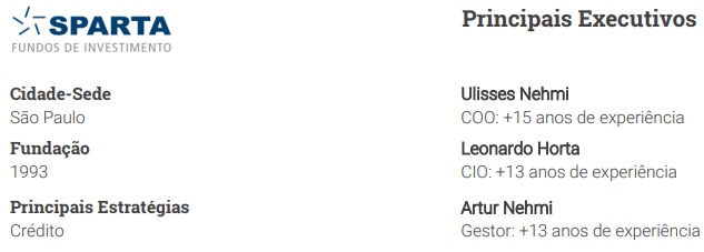 A Sparta possui 24 colaboradores, dos quais 8 são sócios e ocupam funções chave na empresa. A equipe se divide em 3 áreas: gestão, distribuição e risco e compliance. A gestão das estratégias de crédito privado conta com 2 gestores e 5 analistas. O Comitê de Crédito é composto pelos 2 gestores, além do CIO e do diretor de risco e compliance (com direito de veto), todos sócios da empresa.