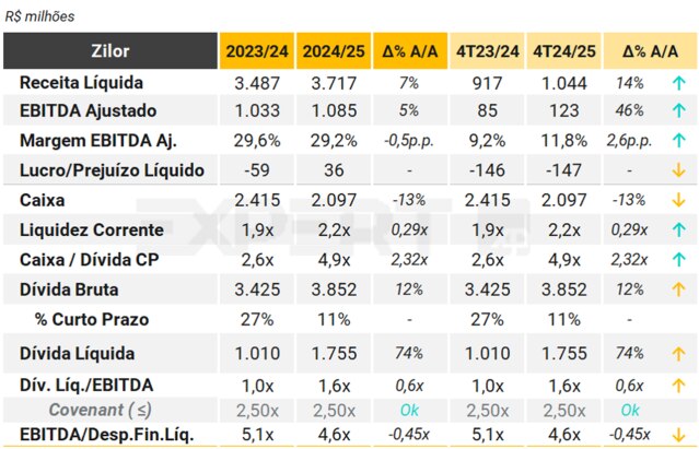 No 4T25, a Zilor reportou receita líquida consolidada de R$ 1,0 bilhão, crescimento de 13,8% em relação ao 4T24, impulsionada principalmente pelo aumento nas receitas de etanol e da unidade Biorigin. A integração da Unidade Salto Botelho (USB), adquirida em dezembro de 2024, contribuiu com R$ 24,3 milhões em receita na safra, embora ainda sem operação industrial no período.