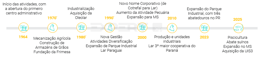 A Lar Cooperativa é uma das maiores empresas no setor de agronegócio¹ do país e foi fundada em 1964 por agricultores do RS e SC. No início de suas atividades, havia bastante variedade entre os produtos gerados pelos associados, como suínos, milho, arroz, etc. Por outro lado, devido a entraves logísticos e políticos, no início dos anos de 1970, a sede foi transferida de Missal para Medianeira e a liderança foi passada para o Irineo da Costa Rodrigues, o qual enxugou a estrutura e promoveu uma maior industrialização da Lar.