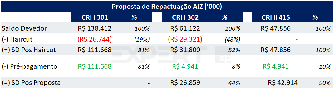 A AIZ recebeu uma proposta de R$ 185 milhões pelo imóvel Galpão que está em garantia (abaixo do seu valor de laudo de avaliação de R$ 192 milhões) e, para que a venda aconteça, os credores terão que aprová-la. Junto à permissão da venda, a AIZ está propondo um reajuste nas condições comerciais dos CRIs, que afetará os termos de pagamento do CRI 302 e precisa ser aprovada pelos credores.