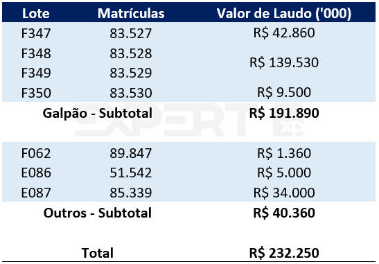 | Imóvel “Galpão” | Agrupamento de imóveis composto pelas matrículas: 83.527, 83.528, 83.529 e 83.530. Seu valor de venda, segundo o laudo de avaliação, é R$ 192 milhões. |