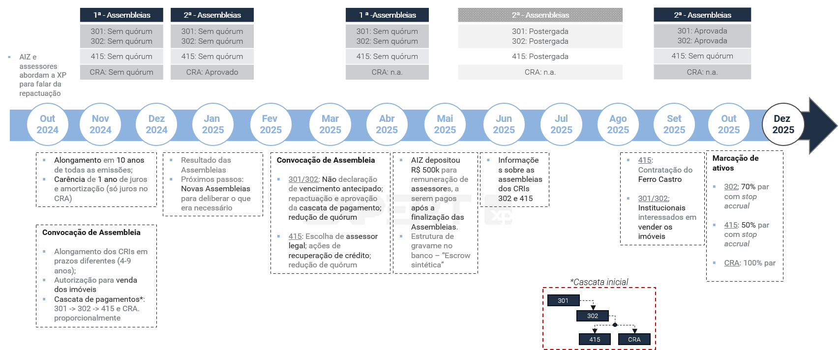 Após a realização da primeira e da segunda leva de assembleias, realizadas ao longo de 2025, as securitizadoras das emissões identificaram a necessidade de fazer uma nova rodada para o CRI AIZ 301 e 302.