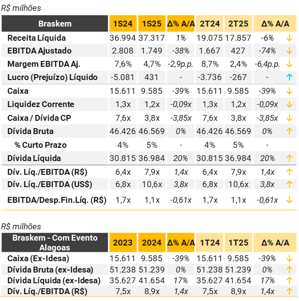 A dívida líquida da Braskem aumentou 20% A/A, para R$ 37 bilhões no final do 2T25. A alavancagem em reais aumentou 1,4x no trimestre, para 7,9x DL/EBITDA (de 6,4x no 2T24), explicada principalmente pela queda no EBITDA UDM no período. A Braskem queimou caixa no nível operacional, com o capex (R$ 489 milhões) sozinho sendo maior que o EBITDA. Incluindo pagamentos de juros (R$ 766 milhões) e pagamentos de Alagoas (R$ 400 milhões), o consumo total de caixa no trimestre foi de R$ 1,45 bilhão (cerca de USD 256 milhões).