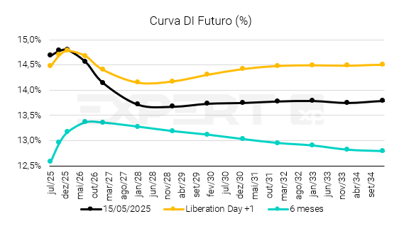 Desde o dia seguinte ao Liberation Day, quando os mercados apresentaram sua reação inicial aos anúncios de tarifas, a curva de juros brasileira já teve mudança expressiva. O movimento reflete as expectativas dos investidores de uma taxa de juros mais baixa a partir de meados de 2026, o que tem um componente de risco de recessão global.