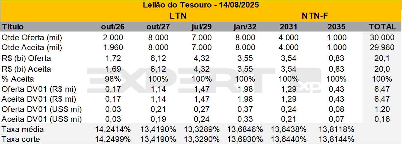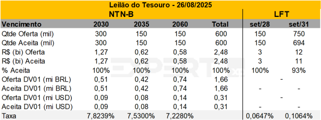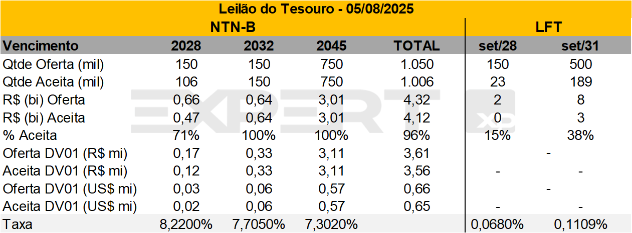 • Resultado: A oferta de títulos pós-fixados foi totalmente aceita pelo mercado. Destaca-se o fechamento das taxas das Bs, principalmente nos vencimentos de 2032 e 2045, em comparação com o leilão do dia 05/08.
