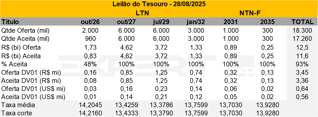 • Resultado: A oferta de títulos foi praticamente totalmente aceita pelo mercado, com apenas a LFT de vencimento em setembro de 2031 não tendo alocação total (93%). Destaca-se a abertura das taxas das NTN-Bs em relação ao leilão do dia 12/08.