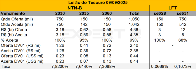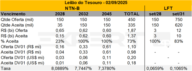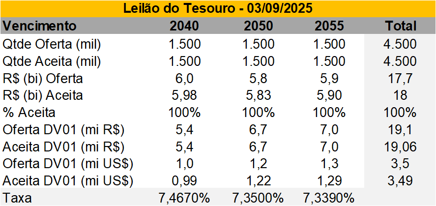 • Resultado: A oferta de títulos não teve aceitação total pelo mercado, com destaque para a NTN-B 2035 e a LFT 2031, que apresentaram 95% e 68% de aceitação, respectivamente. Destacamos a abertura das taxas das NTN-Bs em relação ao leilão anterior (26/08).