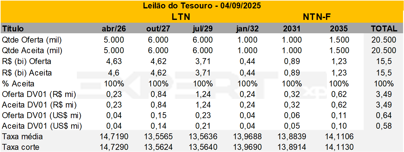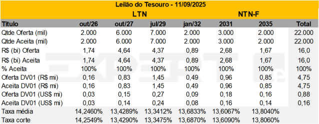 De Olho nos Leilões do Tesouro | Setembro 2025; Leilão com financeiro semelhante ao da semana passada, mas com maior DV01 (11/09)