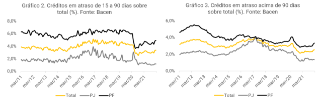 Nos gráficos a seguir, observamos que o atraso e a inadimplência de maneira geral continuam em patamares baixos, o que pode parecer contraintuitivo. No entanto, vale lembrar das medidas emergenciais que foram adotadas pelo governo e Banco Central desde o início da pandemia, como repactuação das parcelas, auxílio emergencial e linhas de crédito para pequenas e médias empresas. Para as pessoas físicas, inadimplência e atrasos vêm aumentando no período recente, como veremos adiante, gerando alerta importante.