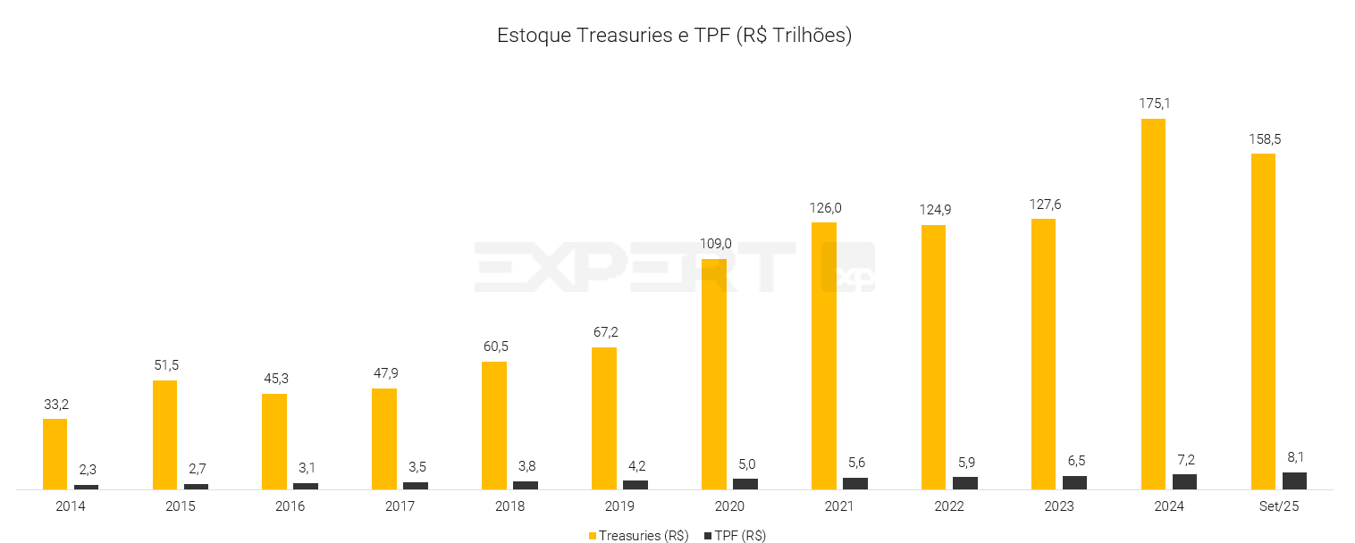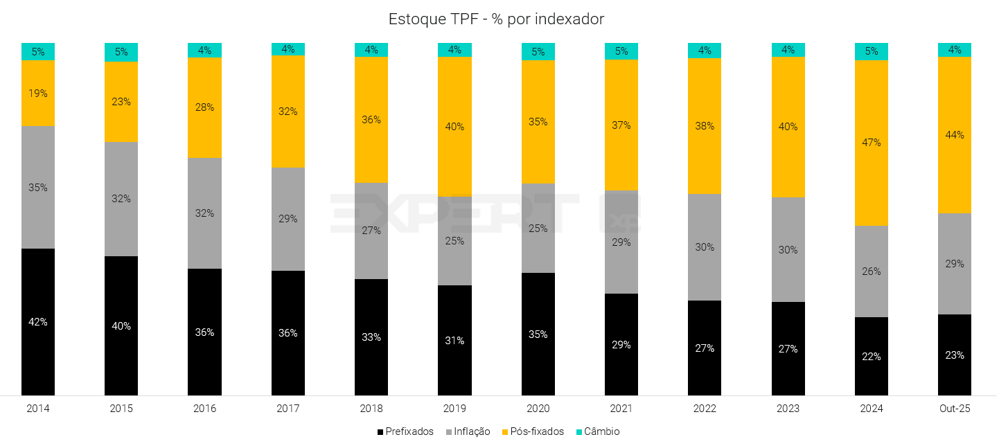 No Brasil, a maioria (~45%) dos TPF em estoque é pós-fixada, o que tem relação com a dinâmica histórica de juros altos e voláteis no país. A distribuição dos últimos anos se deu da seguinte maneira: