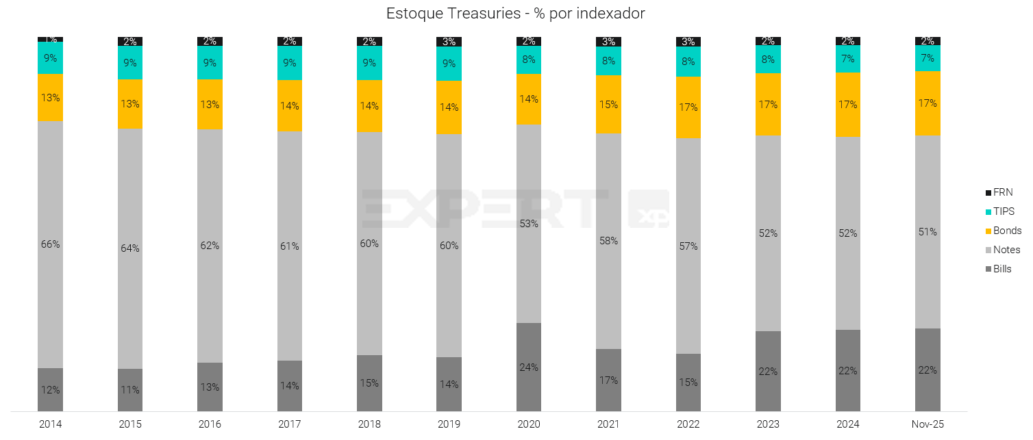 Diferentemente do mercado brasileiro, a maioria (~90%) dos títulos soberanos norte-americanos é prefixada, com ou sem pagamentos semestrais de cupons (semelhante às NTN-Fs ou LTNs). A concentração em prefixados tem relação com a taxa de juros historicamente baixa e relativamente estável praticada na economia dos EUA.