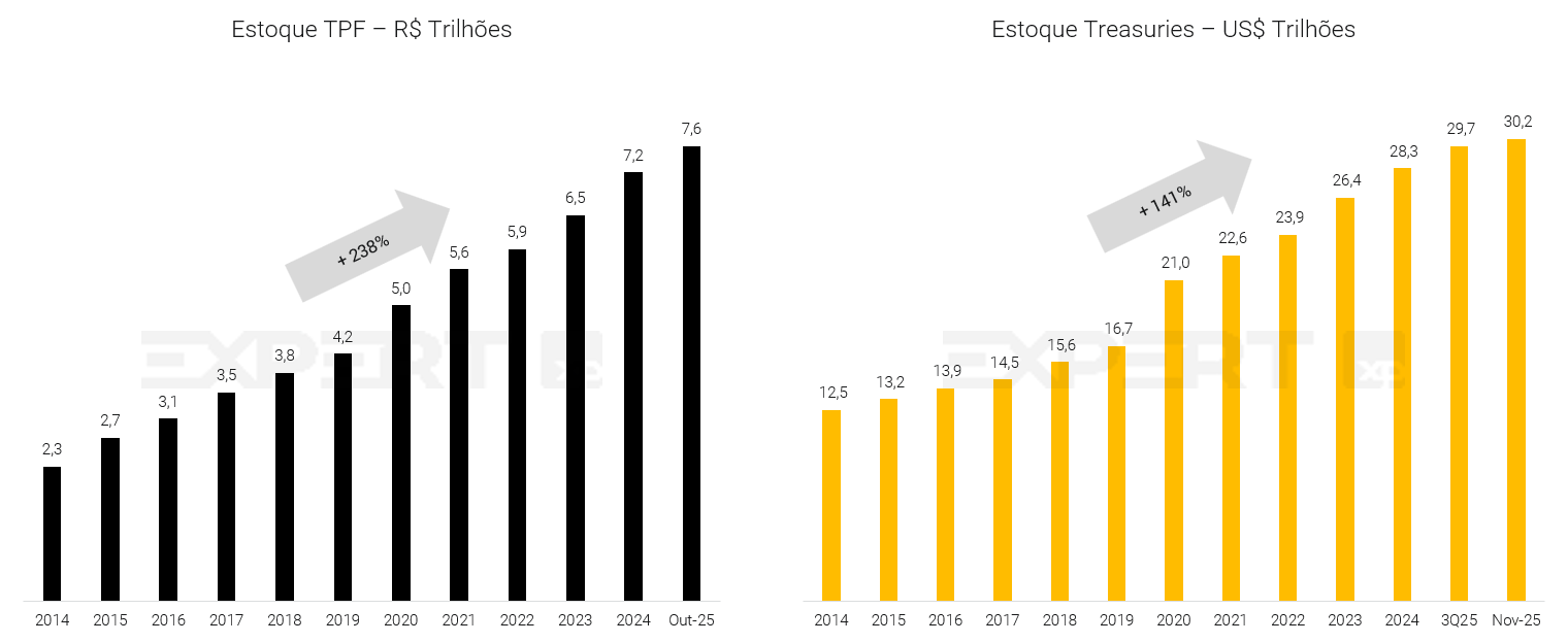 É interessante notar que ao longo dos últimos anos, tanto Treasuries quando TPFs apresentaram forte expansão em seu estoque, quando considerada a moeda original do título (dólar ou real).