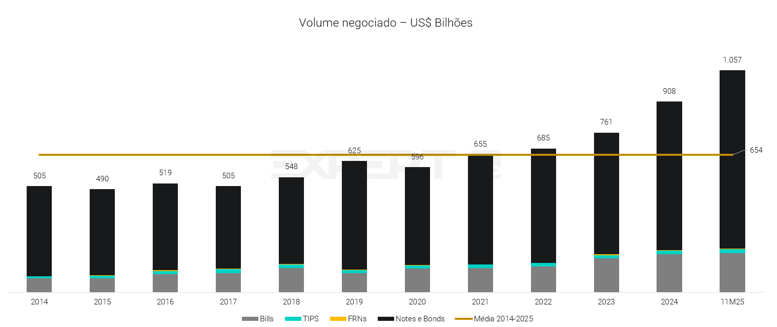 Risco de liquidez: refere-se à facilidade para negociações do título no mercado secundário, no qual um título com poucos compradores potenciais pode ser desvalorizado no momento de uma cotação de venda. O mercado de Treasuries possui liquidez expressiva, com volumes atingindo US$ 654 bilhões de negociação média anual nos últimos 12 anos.