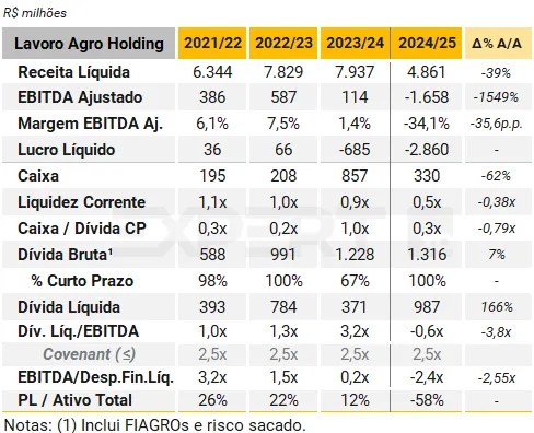 A safra 2024/25 confirmou a deterioração do perfil de crédito da Lavoro, em meio à crise do setor de insumos agrícolas no Brasil e já sob recuperação extrajudicial. A própria Companhia atribui a piora a uma combinação de fatores, principalmente: