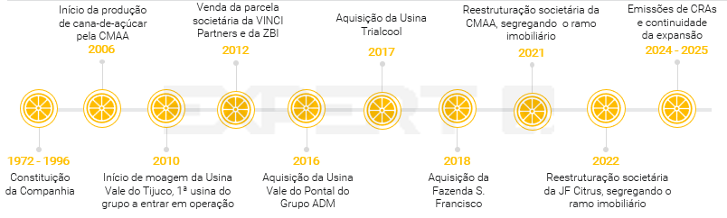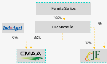 Em 2021, a JF Citrus passou por uma reestruturação societária, que incluiu a venda de aproximadamente 5.300 hectares de terras com cana-de-açúcar para a CMAA. A operação também consolidou a ligação entre as duas empresas, com a CMAA detendo 50% de participação na JF Citrus, por meio do FIP Marseille, veículo de investimento controlado pela Família Santos.