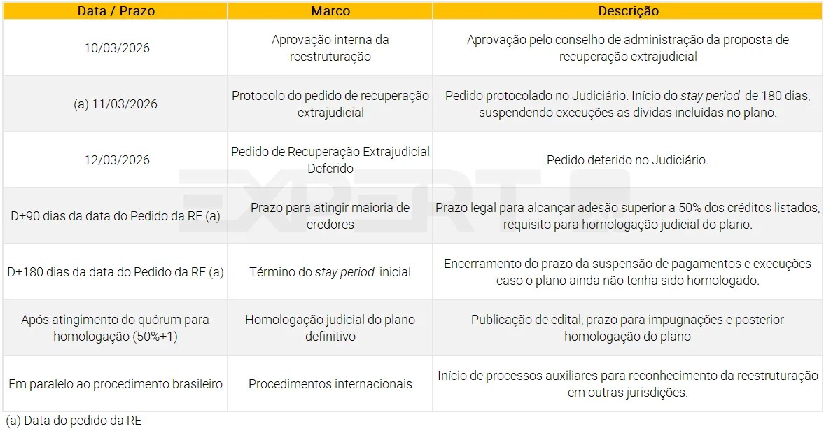 A Companhia obteve apoio inicial de 47% dos credores – acima do mínimo legal de 1/3 -, permitindo pedir standstill de 90 dias, prorrogáveis por mais 90 dias, visando preservar o seu caixa enquanto negocia o plano de recuperação extrajudicial (“PRE” ou “Plano”). Para a Companhia conseguir levar o plano para o juiz aprovar, será preciso no mínimo 50%+1 dos credores apoiando o Plano.