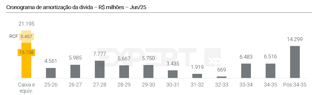 Esse movimento foi impulsionado pela substituição de R$ 8,9 bilhões em contratos de risco sacado por instrumentos de dívida de longo prazo, além de um aumento de 55,8% na dívida líquida, que atingiu R$ 49,2 bilhões. Apesar disso, ressaltamos que a Companhia mantém liquidez robusta, com R$ 15,7 bilhões em caixa e R$ 5,5 bilhões em linhas comprometidas, além de ter realizado novas captações de R$ 5,9 bilhões, incluindo bonds internacionais de 7 anos. O prazo médio do endividamento foi alongado para 8,2 anos – ante 6,0 anos A/A.