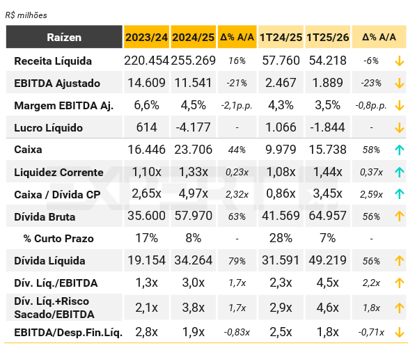 No 1T25/26, a Raízen apresentou um trimestre desafiador, marcado por: (i) aumento da alavancagem, impulsionada pela substituição de contratos com fornecedores (risco sacado) por dívida; (ii) ganhos de eficiência operacional ; (iii) condições climáticas adversas, que reduziram os volumes de moagem e limitaram a diluição de custos; e (iv) perdas em estoques na Distribuição de Combustíveis no Brasil, agravadas por uma parada de manutenção mais longa do que o esperado na Argentina. A receita líquida consolidada da Raízen no trimestre foi de R$ 54,2 bilhões, representando uma queda de 6% A/A, enquanto o EBITDA consolidado reduziu 23% A/A, com margem de 3,5% (-0,8p.p. A/A).