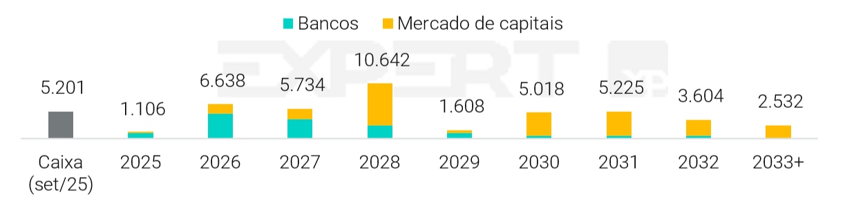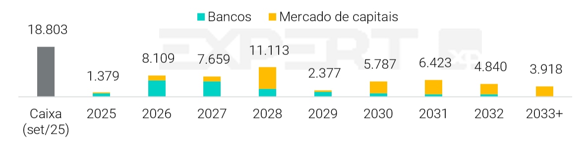 A liquidez é avaliada como suficiente, com R$ 17,1 bilhões em caixa consolidado, dos quais mais de 75% concentrados na CSN Mineração — valor sujeito a desconto de acesso de cerca de 30%, devido à presença de acionistas minoritários. Apesar do colchão de liquidez, o consumo de recursos permanece elevado: a S&P projeta fluxo de caixa operacional livre (após investimentos e despesas financeiras) negativo em cerca de R$ 4 bilhões em 2025, pressionado por capex de R$ 5,5 bilhões e despesas de juros próximas a R$ 5,4 bilhões, mesmo considerando receita financeira de R$ 1,3 bilhão.