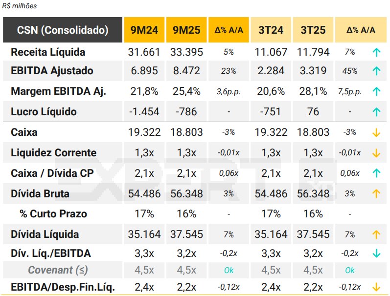 A CSN reportou resultados sequencialmente melhores no 3T25, apoiado por: (i) fortes resultados das operações de mineração(ii) melhoria do desempenho da divisão de Cimento; (iii) um sólido desempenho da divisão de Logística; e (iv) um desempenho mais fraco na divisão de Aço.