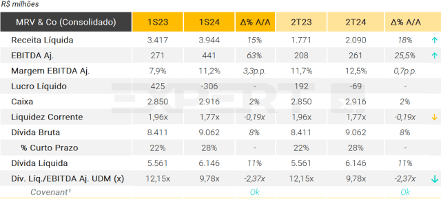 A MRV & Co registrou um trimestre misto no segundo trimestre de 2024, com um aumento de 18% na receita líquida em relação ao mesmo período do ano anterior, totalizando R$ 2,090 bilhões. A margem EBITDA ajustada alcançou 12,5% (+0,7p.p, A/A), aumento impulsionado por um melhor desempenho operacional.
