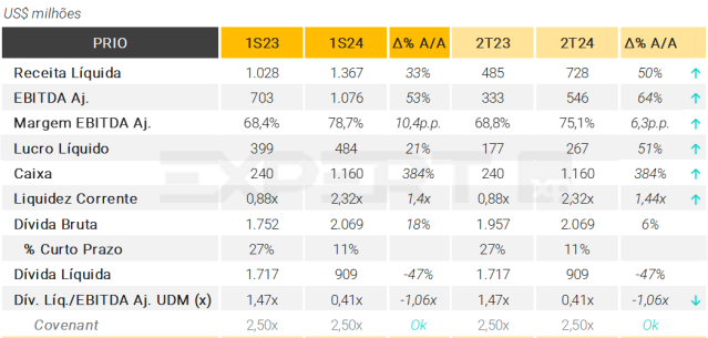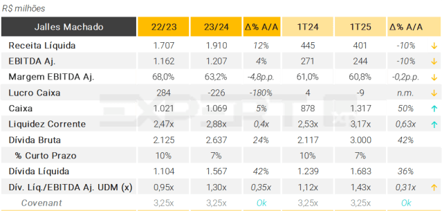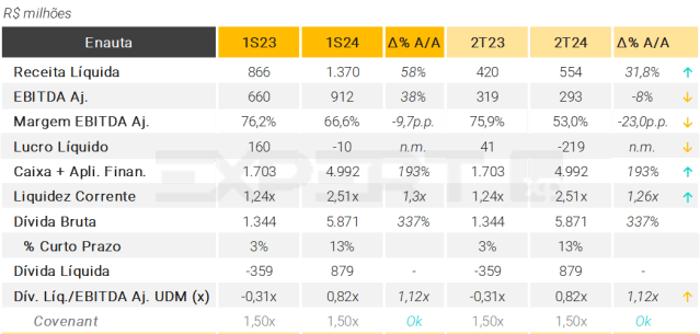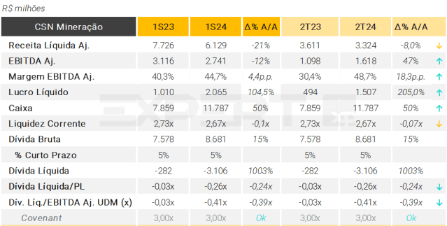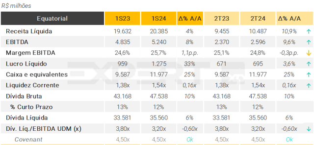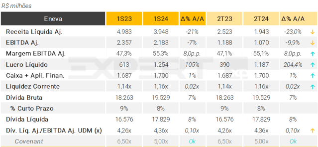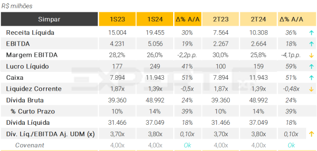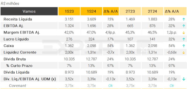 A Companhia possui covenant de índice de cobertura do serviço da dívida (ICSD), que deve ser acima de 1,3x. No 2T24, afirmou estar em concordância com o índice.