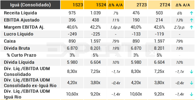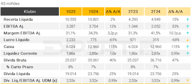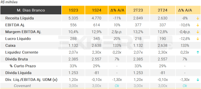No acumulado do 1S24, tanto a receita líquida quanto o EBITDA caíram 1% em relação ao mesmo período do ano anterior.