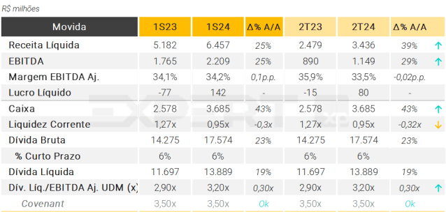Em relação ao endividamento, no 2T24, a Companhia apresentou dívida bruta de R$ 17,6 bilhões, o que representa uma expansão de 23% na comparação anual, sendo apenas 6% de curto prazo. Sua alavancagem, medida pelo indicador dívida líquida/EBITDA, encerrou o 2T24 em 3,2x, um aumento de 0,1x T/T e 0,3x A/A. Assim, a Movida se manteve em conformidade com seus covenants, que limitam o indicador em ser igual ou menor que 3,5x. Com as captações realizadas no trimestre, a Companhia também foi capaz de elevar o prazo médio de 3,9 anos no 1T24 para 4,2 anos no 2T24.