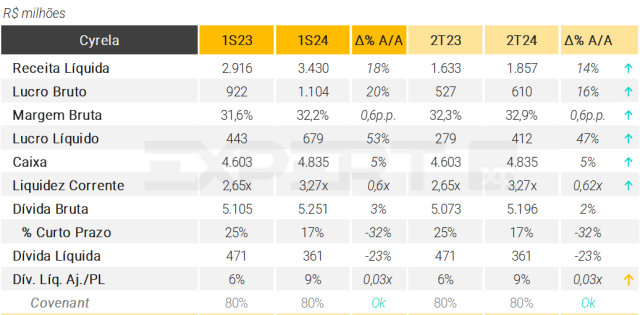 Em relação ao endividamento, a Cyrela teve aumento de 2% A/A em sua dívida bruta (R$ 5,2 bilhões), sendo 17% referente a obrigações de curto prazo. Sua alavancagem financeira, medida pelo indicador dívida líquida/ Patrimônio Líquido, se elevou em 0,03 p.p. até 9% no 2T24. Assim, o Grupo se manteve em conformidade com seus covenants, que limitam o indicador em ser igual ou menor que 80%.