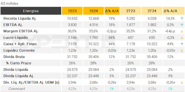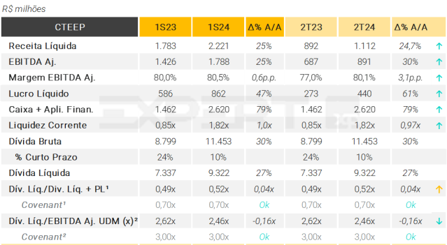 No 2T24, a Cemig registrou uma receita líquida de R$ 9,4 bilhões (+7% vs. 2T23). O EBITDA ajustado aumentou 2% (A/A), alcançando R$ 1,9 bilhão no mesmo período. A melhoria dos indicadores foi impulsionada pelo reajuste tarifário de 7,4% para a distribuidora, e o de 5,4% na Receita Anual Permitida (RAP) das transmissoras para o ciclo 2024-2025, o recebimento de R$ 2,7 bilhões referente à alienação da participação na Aliança Energia e a reversão de provisões tributárias relacionadas a contribuições previdenciárias, totalizando R$ 548 milhões. Com isso, a empresa apresentou um crescimento relevante em suas receitas, mantendo um controle rigoroso sobre custos e despesas.