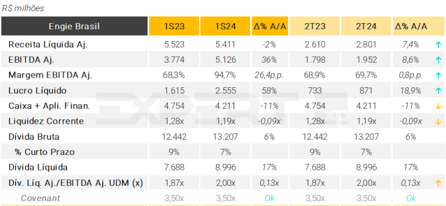 O endividamento líquido foi de R$ 2,2 bilhões, quase em linha com o ano anterior. A alavancagem, medida por dívida líquida / EBITDA, foi de 3,84x (ante 4,73x no 2T23), próxima ao covenant de 4,0x (o índice reduz para 3,5x em 2025, com quedas sucessivas de 0,5x anualmente até 1,0x em 2031). As dívidas são garantidas pela holding e não há cross-default (vencimento antecipado cruzado) com outras subsidiárias.