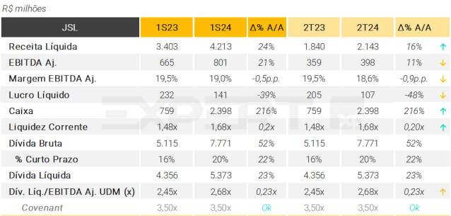 Já em relação ao endividamento, a Companhia sofreu efeitos da aquisição da IC e FSJ, com sua dívida bruta (R$ 7,8 bilhões) tendo se elevado em 52% A/A no 2T24, sendo 22% de curto prazo. Sua alavancagem, medida pelo indicador dívida líquida/EBITDA, encerrou o 2T24 em 2,68x, um incremento de 0,23x A/A. Assim, a JSL se manteve em conformidade com seus covenants, que limitam o indicador em ser igual ou menor que 3,5x.