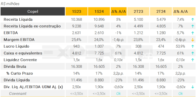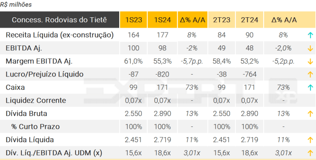 No 2T24 houve aumento de 11% no tráfego, impulsionado por veículos pesados (+16% A/A), e de 4,5% na tarifa média frente ao 2T23. Como resultado, a receita líquida (excluindo receita de construção) cresceu 16% no período. No acumulado do 1S24, o crescimento foi de 15% A/A.
