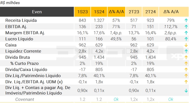 A liquidez corrente aumentou, passando de 2,8x no 2T23 para 4,2x no 2T24. A dívida bruta cresceu 52% no 2T24 (A/A), totalizando R$ 1,4 bilhão. A alavancagem, medida pela relação Dívida Líquida/EBITDA, foi de 1,8x no 2T24 (a Companhia havia reportado caixa líquido no 2T23). A Even permanece em conformidade com seu covenant financeiro, de ([Dívida Líquida + Contas a Pagar] / Patrimônio Líquido) menor ou igual a 1,2x.