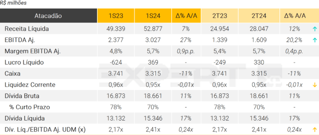 No 2T24, o Grupo Carrefour Brasil – Atacadão registrou uma receita líquida de R$ 28 bilhões, representando um crescimento de 12% em relação ao 2T23. O EBITDA ajustado totalizou R$ 1,6 bilhão, com um aumento de 20,2% em comparação ao mesmo trimestre do ano anterior, impulsionado pela recuperação da demanda e normalização do mercado no setor. A operação de varejo teve seu primeiro crescimento positivo em vendas comparáveis desde o 2T23, apesar dos desafios enfrentados.