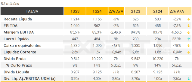 A NTS publicou recentemente números do 2º trimestre de 2024. Operacionalmente, foi um resultado positivo e sem grandes novidades, o que reforça a resiliência de seu modelo de negócios: margens elevadas e estáveis, forte geração de caixa, alavancagem baixa e controlada mesmo com forte distribuição de dividendos. Também é positiva a liquidez da Companhia, bastante elevada e com caixa suficiente para fazer frente a mais de 4 anos do serviço da dívida, mesmo considerando a distribuição de dividendos de R$ 1,5 bilhão efetuada após o fechamento dos números de junho/2024. A alavancagem encerrou o trimestre em 2,8x, em conformidade com seu covenant de até 4,0x.