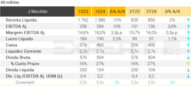 No 2T24, a J. Macêdo, proprietária das marcas Petybon e Dona Benta, registrou uma receita líquida de R$ 850 milhões, apresentando um crescimento de 2% em relação ao 2T23. Essa estabilidade pode ser explicada por dois fatores principais: a redução de 11,5% na receita bruta da categoria de farinha e farelos, e um crescimento de 13,1% na receita bruta do setor de massas, indicando uma estabilização. O EBITDA ajustado encerrou o trimestre em R$ 136 milhões, com um aumento de 3,8% A/A.